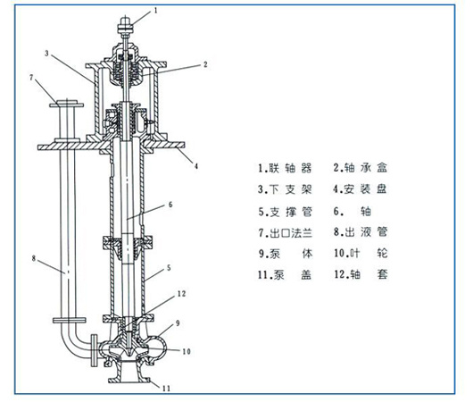 FY型液下化工泵主要由泵体、泵盖、叶轮、轴、弹性联轴器、管法兰、导轴承、中间接管、上下出液管、轴承架、底板等零件组成。