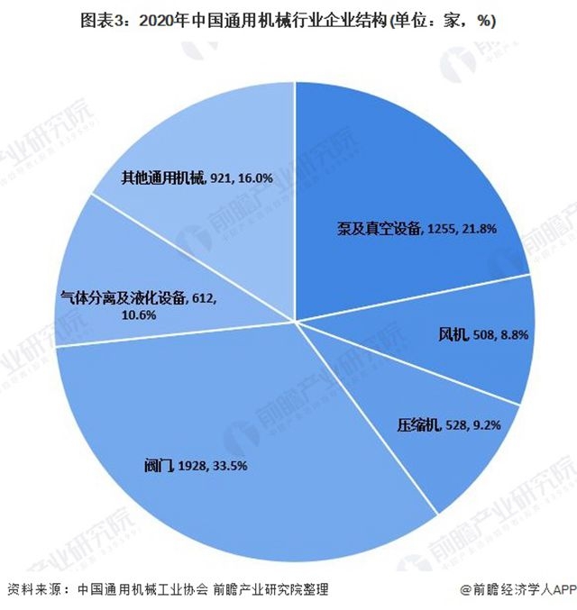 2020年,我国通用机械行业规模以上企业共计2752家,其中:泵1255家,占整体规模21.8%;风机508家,占整体规模8.8%;气体压缩机528家,占整体规模9.2%;阀门1928家,占整体规模33.5%;气体分离及液化612家,占整体规模10.6%;其它通用机械921家,占整体规模16.0%。